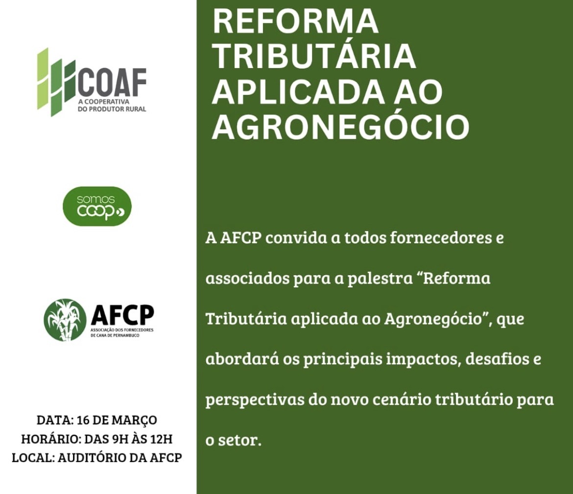 O novo cenário tributário para o segmento canavieiro diante da reforma tributária que abarca todo o agronegócio será abordado durante palestra promovida na Associação dos Fornecedores de Cana de Pernambuco (AFCP) nesta segunda-feira (16), a partir das 9h.